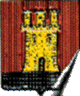 Château donjonné de trois tours : représente la forme du château, donc, ici, une fortification à trois tours rondes crênelées et non toiturées, avec une porte fermée. |
